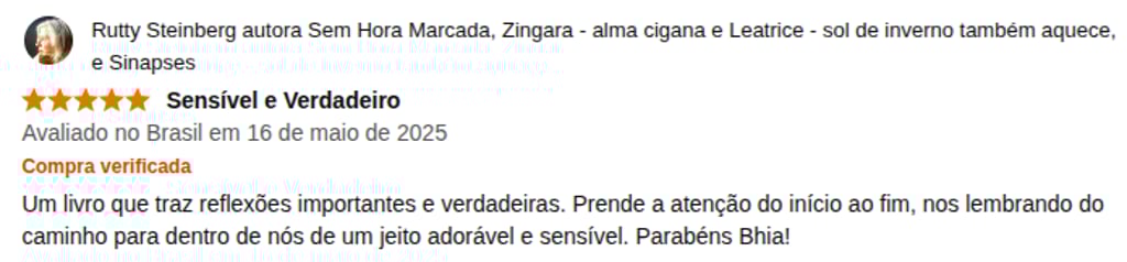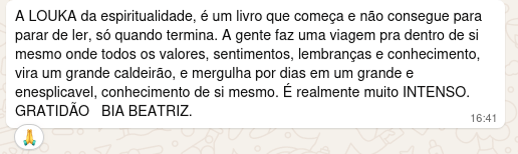 Gostei muito do livro, da maneira simples como você aborda a espiritualidade no dia a dia sem misticismo. É um guia para realmente ser colocado em prática e tenho certeza de que os resultados serão os melhores possíveis. Gratidão por esse belo trabalho.